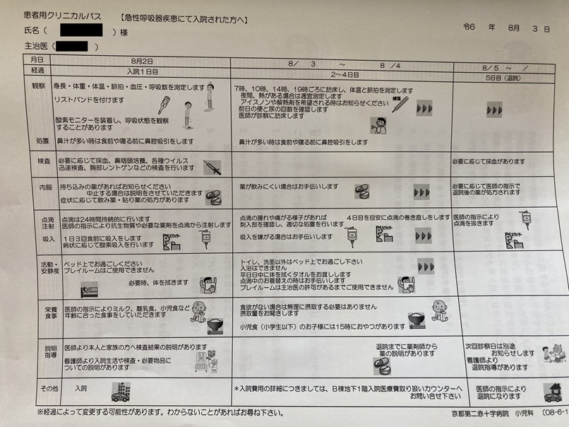 さて、入院中にお子が病院側から受ける処置については詳細の記された用紙を渡されました。